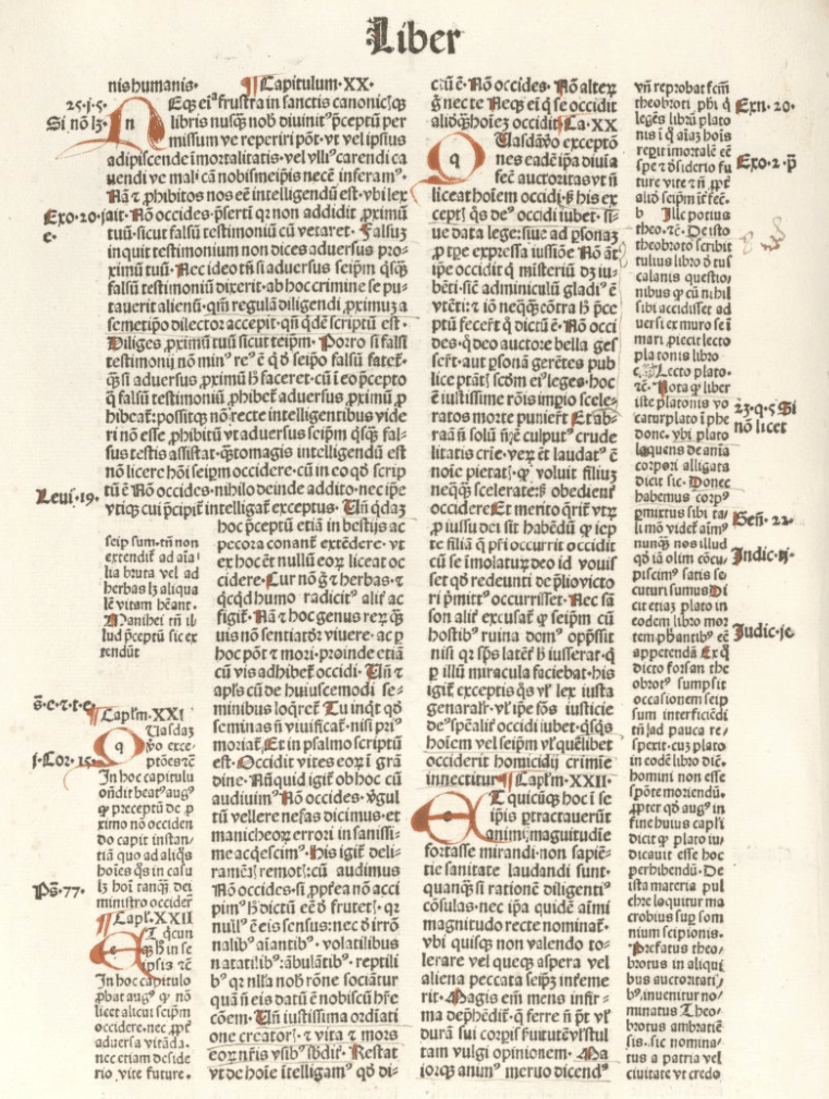 TLÜ AR baltika osakonnas säilitatava De civitate Dei väljaande on 1494. aastal Freiburgis Breisgaus trükkinud Kilianus Piscator (Fischer) Thomas Valois’ (inglisepäraselt Thomas Waleys) ja Nicolaus Trivethi (inglisepäraselt Nicolas Trivet või Trevet) kommentaaridega. Thomas Waleys (u. 1287 – pärast veebruari 1349) oli inglise teoloog, dominikaani munk, kes õpetas Oxfordi ja aastatel 1326–1327 Bolognia ülikoolis. Just siin kirjutas ta oma kommentaari Augustinuse teosele. Vastuolude tõttu paavst Johannes XXII doktriiniga arreteeris ta inkvisitsioon ja teda hoiti 11 aastat ilma kohut mõistmata vangis. Pärast vabanemist pöördus ta tagasi Inglismaale, kus ta ilmselt vana mehena suri (tema kohta lähemalt SIIT). Nicolas Trivet (u. 1258 – u. 1328) oli samuti dominikaani munk, kes on eelkõige tuntud anglosaksi kroonikuna, kelle teostest on mh saanud inspiratsiooni Chauser. Inglismaalt Somersetist pärit Trivet õpetas nagu Waleyski Oxfordi ülikoolis ja ka tema paistab olevat külastanud Itaaliat (Firenzet). (vt lähemalt SIIT)